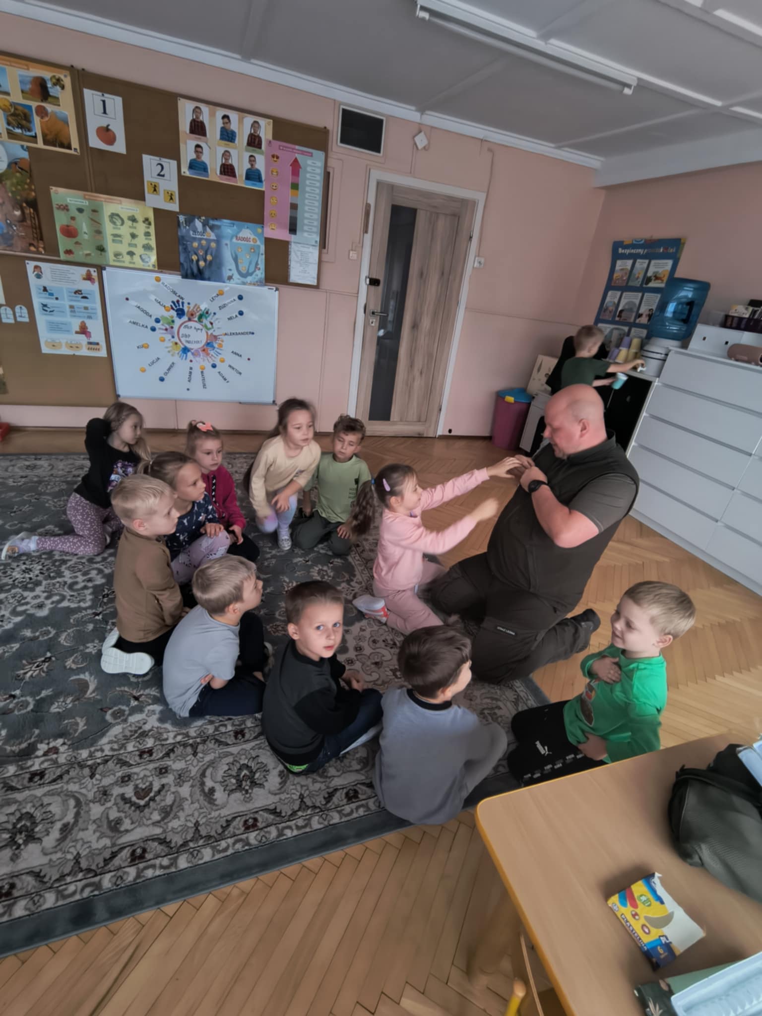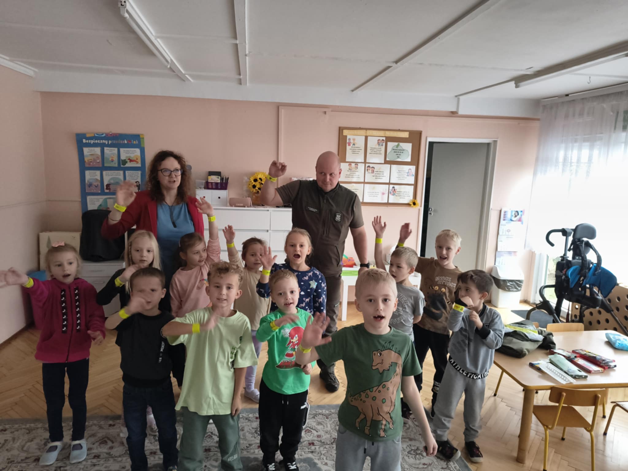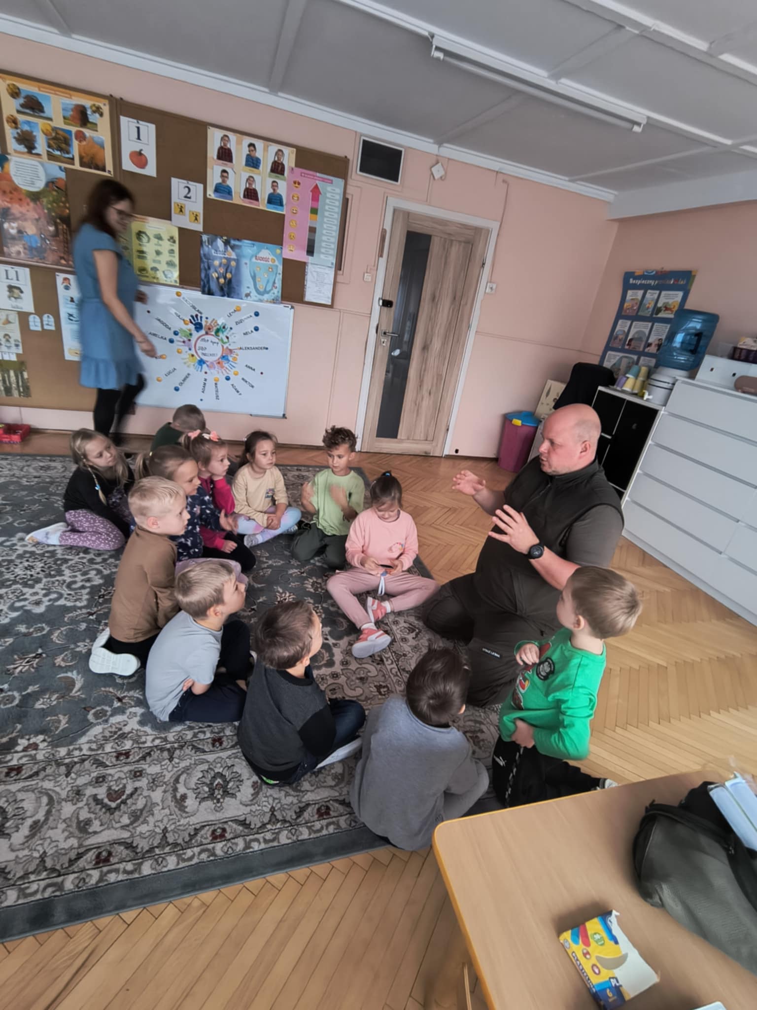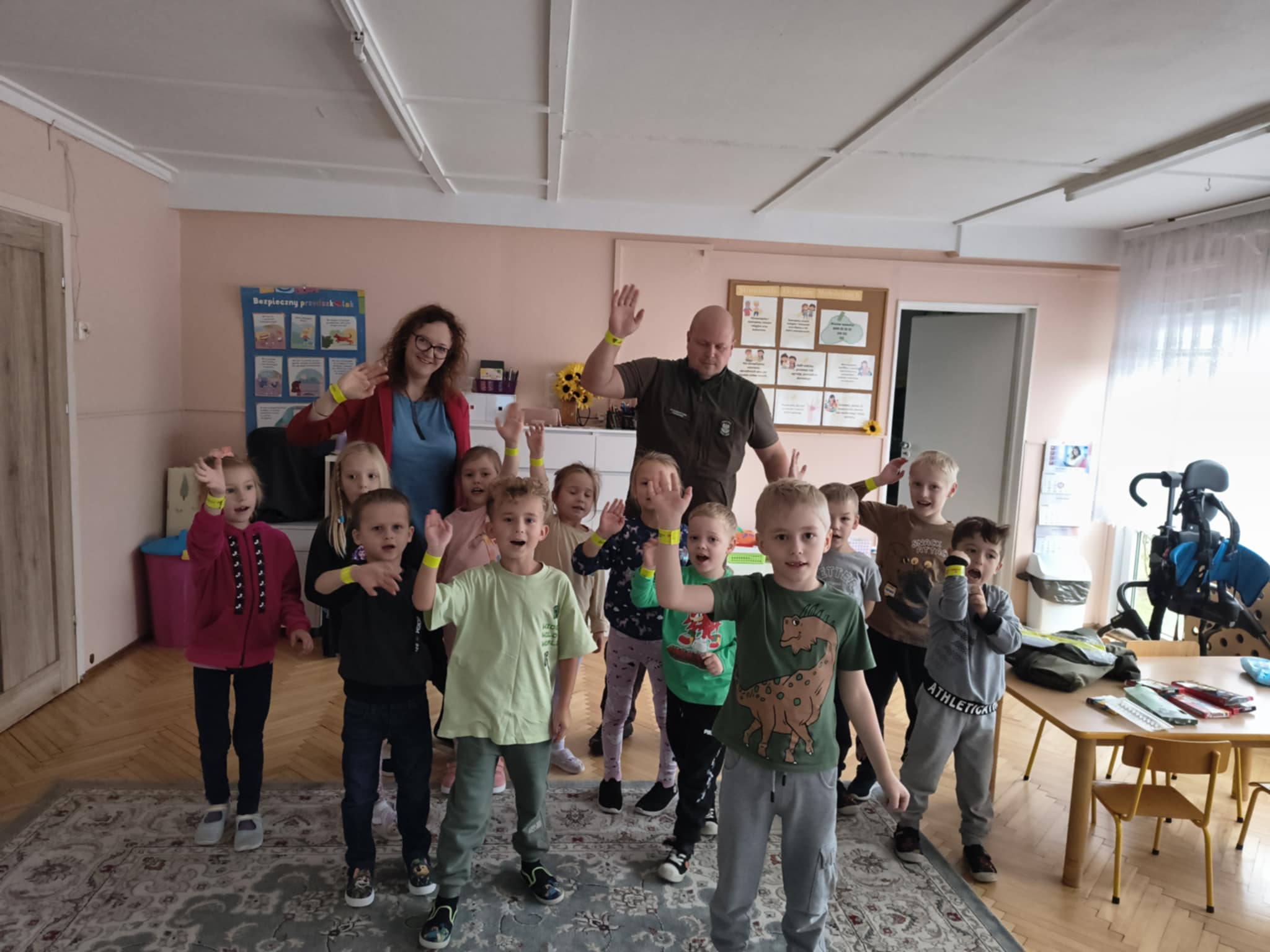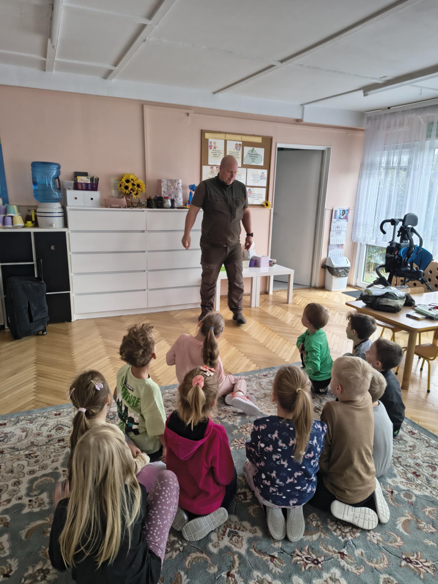 Dnia 16.10 W czwartek odwiedził gr 5 starszy strażnik z Nadleśnictwa w Piotrkowie Tryb. Pan Rafał Tarnowski. Opowiedział dzieciom o zwierzętach jakie zamieszkują w lesie, ich zwyczajach oraz i przygotowywaniu się do zimy. Dzieci dowiedziały się także jak należy zachować się w lesie oraz jak dbać o przyrodę. Spotkanie było bardzo interesujące i pouczające.