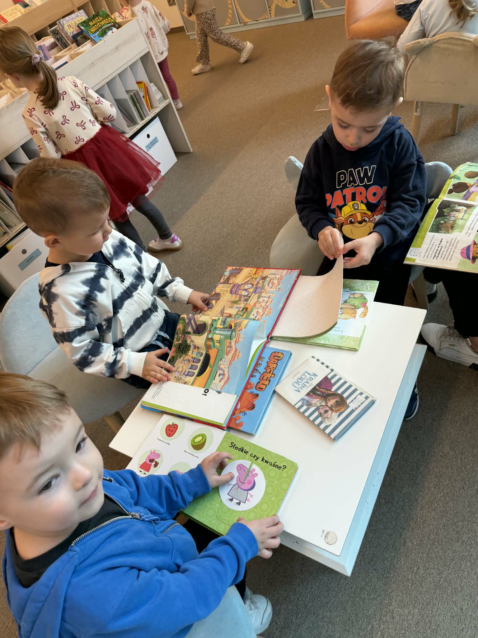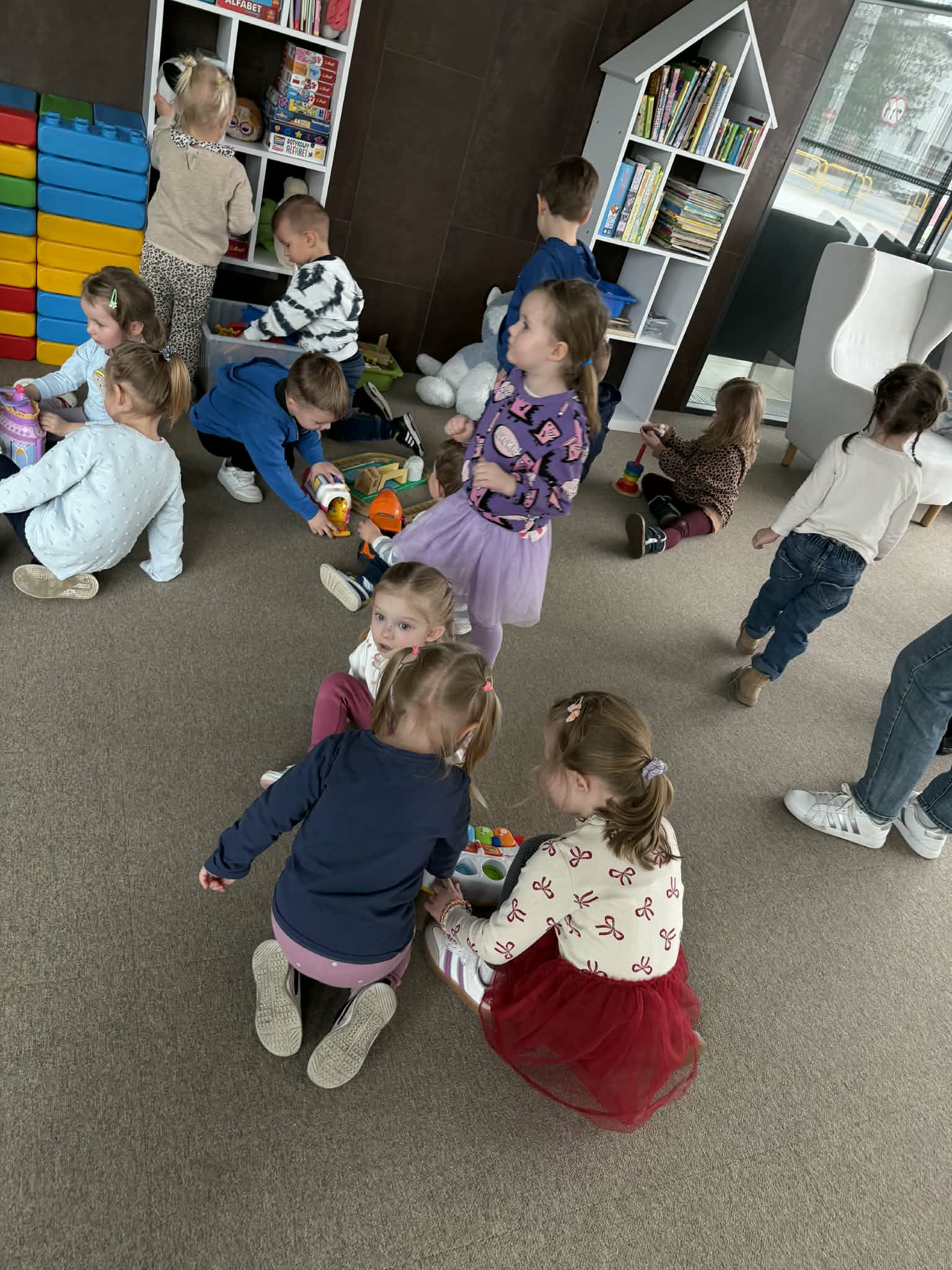 Podczas wizyty w mediatece nasze maluchy zwiedzały bibliotekę, poznając zasady korzystania z książek i próbując swoich sił w ich wypożyczaniu. Nie zabrakło też czasu na swobodną zabawę w bawialni – pełną śmiechu, ruchu i wspólnych chwil. To był dzień pełen emocji, nauki i dziecięcej radości.