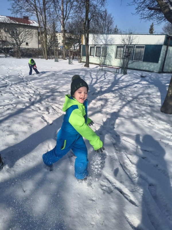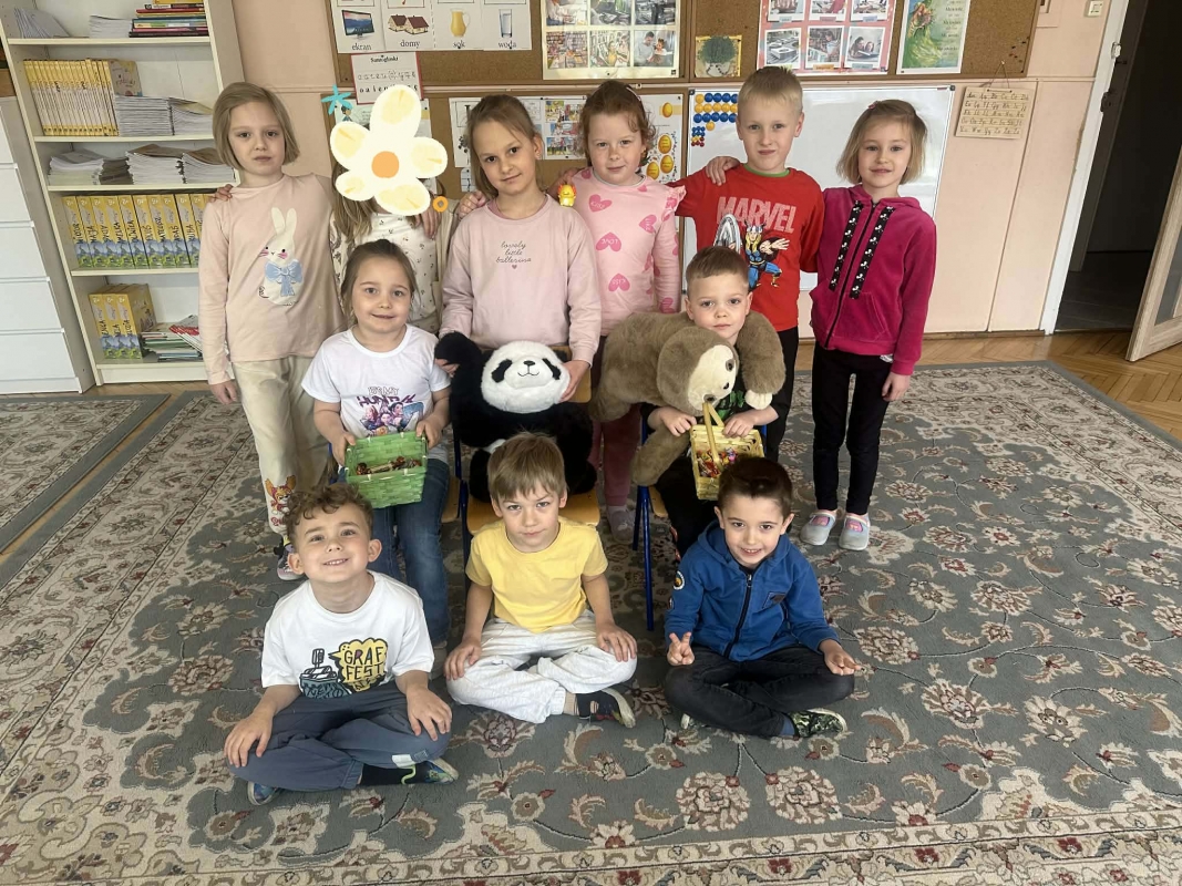 W grupie dzieci 6 letnie w dużym stopniu zdobywają wiedzę, doskonalą się w zdobywanych wcześniej sprawnościach, rozwijają swoje zdolności plastyczne, matematyczne, przyrodnicze i społeczne. Wychowawczynie starają się, aby wszystkie dzieci rozwijały się na miarę swoich możliwości i potrzeb. Dzieci wykonują wiele ćwiczeń rozwijających funkcje wzrokowe, słuchowe, kinestetyczne, w tym analizy i syntezy słów, wyrazów i obrazków. Poznają litery, cyfry, liczby. Rozwiązują zagadki, łamigłówki, wykonują przeróżne zadania. Bawią się i pracują indywidualnie i w zespołach. Chodzą na spacery, jeżdżą na wycieczki edukacyjne, na spektakle do kina i teatru. Przygotowują się do nauki w klasie I. Osiągnięcia prezentują na wystawach, przedstawieniach, występach. Jest to grupa dzieci wyjątkowych, żywiołowych, biorących chętnie udział w różnych przedsięwzięciach. W tej grupie unikamy do minimum rywalizacji, bo dzieci są wyjątkowo ambitne, lubią wygrywać, zdobywać najwyższe laury, ale czasem kosztem silnych przeżyć. Bardzo lubią budować skomplikowane budowle i konstrukcje z klocków, czytają czasopisma. Bardzo chętnie chodzą na nasz plac zabaw. Niechętnie wychodzą do domu.